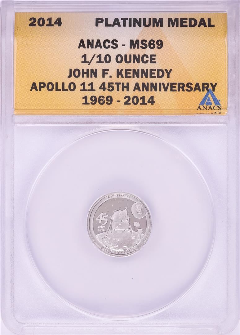 One 2014 Proof 1/10 oz Platinum JFK Apollo 11 Anniversary Medal ANACS MS69. ANACS Certified.