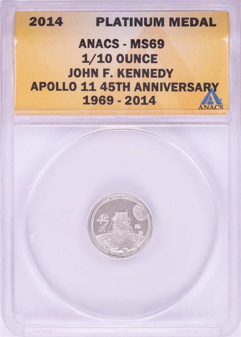 One 2014 Proof 1/10 oz Platinum JFK Apollo 11 Anniversary Medal ANACS MS69. ANACS Certified.