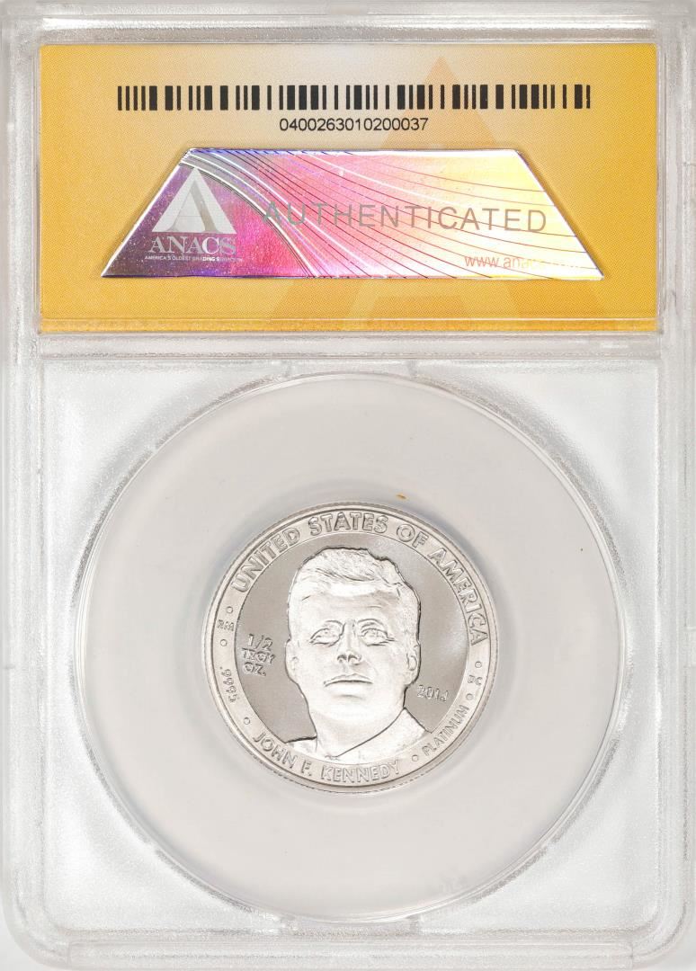 One 2014 Proof 1/2 oz Platinum JFK Apollo 11 Anniversary Medal ANACS MS69. ANACS Certified.