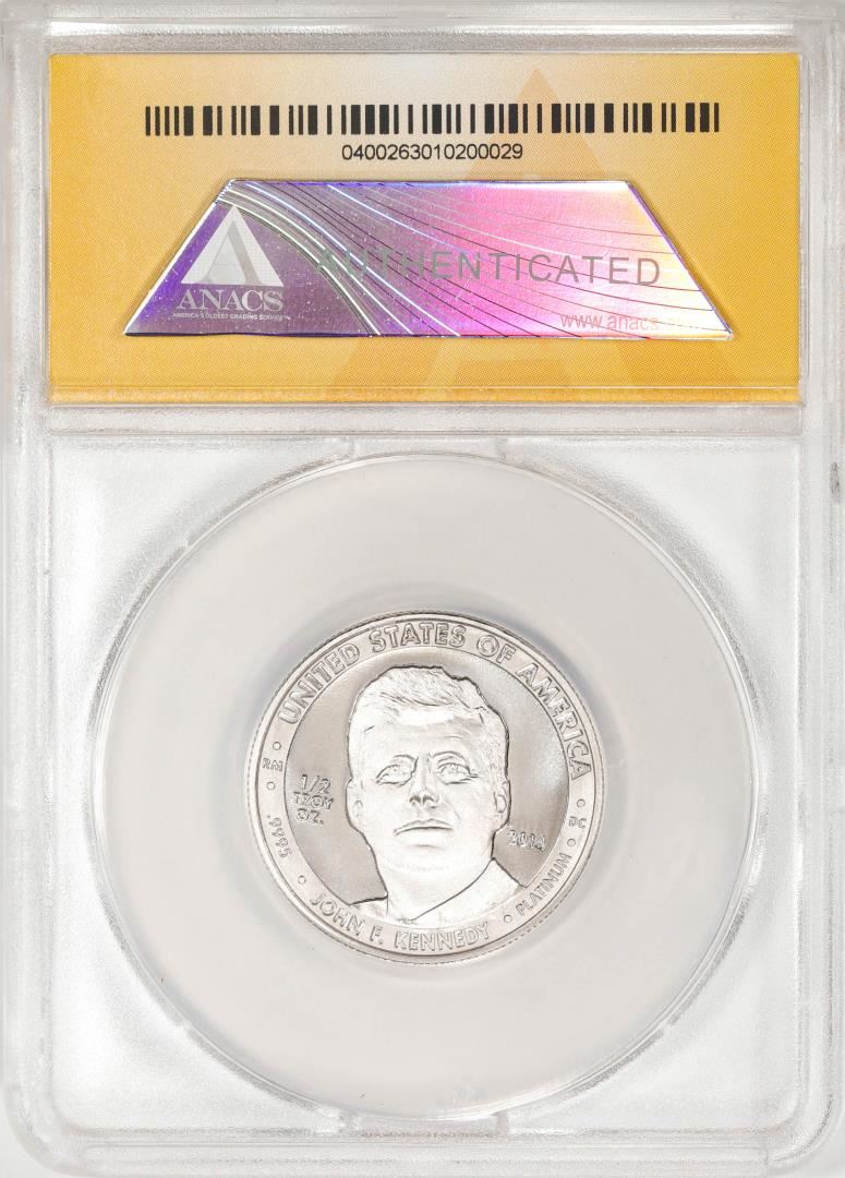 One 2014 Proof 1/2 oz Platinum JFK Apollo 11 Anniversary Medal ANACS MS69. ANACS Certified.