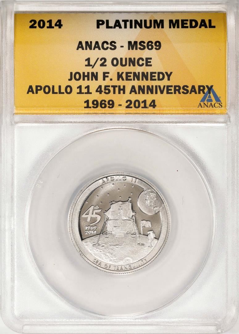 One 2014 Proof 1/2 oz Platinum JFK Apollo 11 Anniversary Medal ANACS MS69. ANACS Certified.