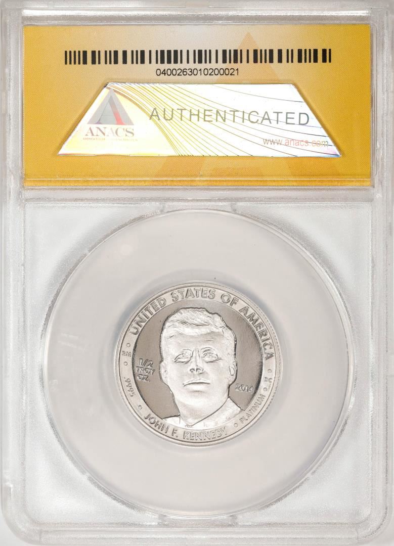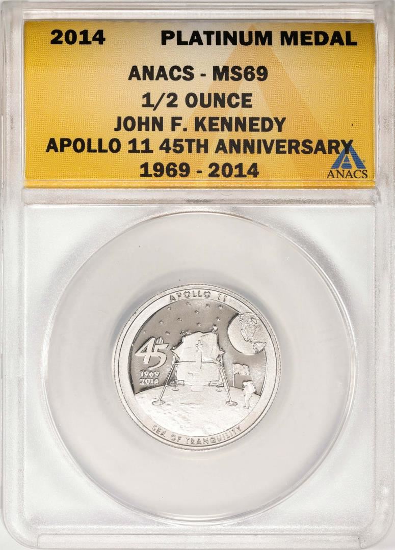 One 2014 Proof 1/2 oz Platinum JFK Apollo 11 Anniversary Medal ANACS MS69. ANACS Certified.