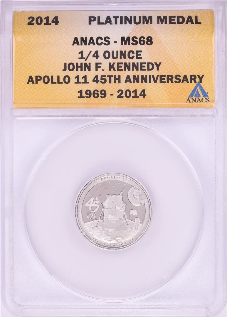 One 2014 Proof 1/4 oz Platinum JFK Apollo 11 Anniversary Medal ANACS MS68. ANACS Certified.