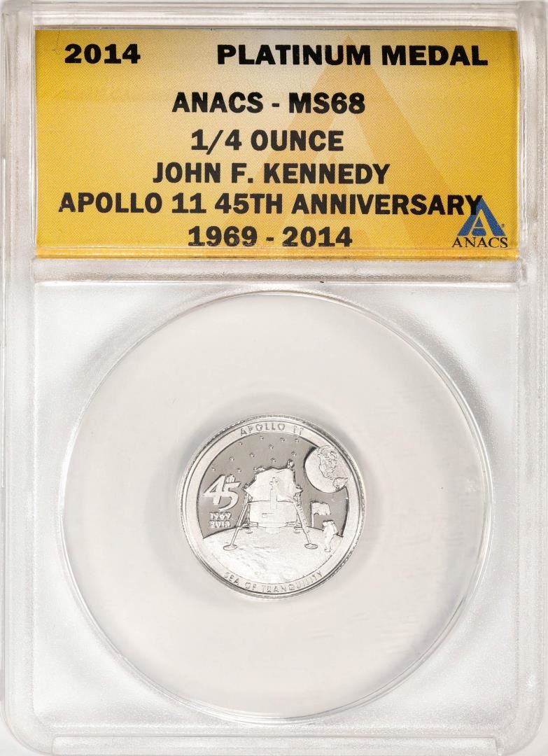 One 2014 Proof 1/4 oz Platinum JFK Apollo 11 Anniversary Medal ANACS MS68. ANACS Certified.