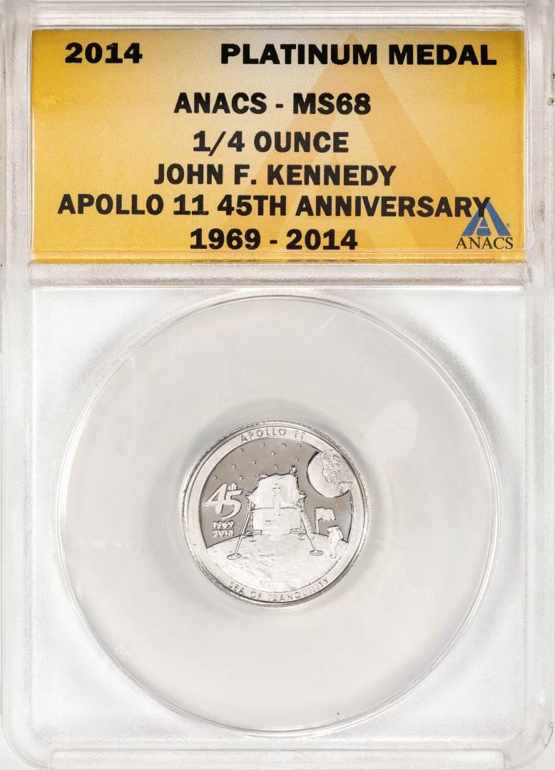 One 2014 Proof 1/4 oz Platinum JFK Apollo 11 Anniversary Medal ANACS MS68. ANACS Certified.