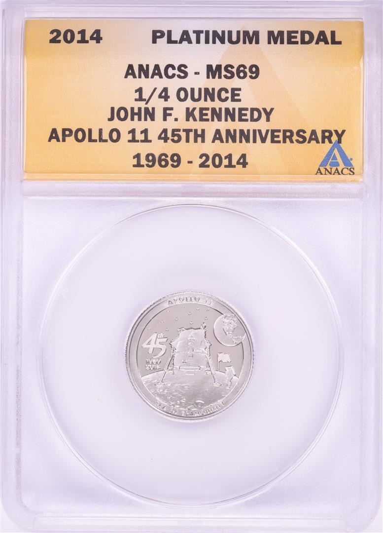 One 2014 Proof 1/4 oz Platinum JFK Apollo 11 Anniversary Medal ANACS MS69. ANACS Certified.
