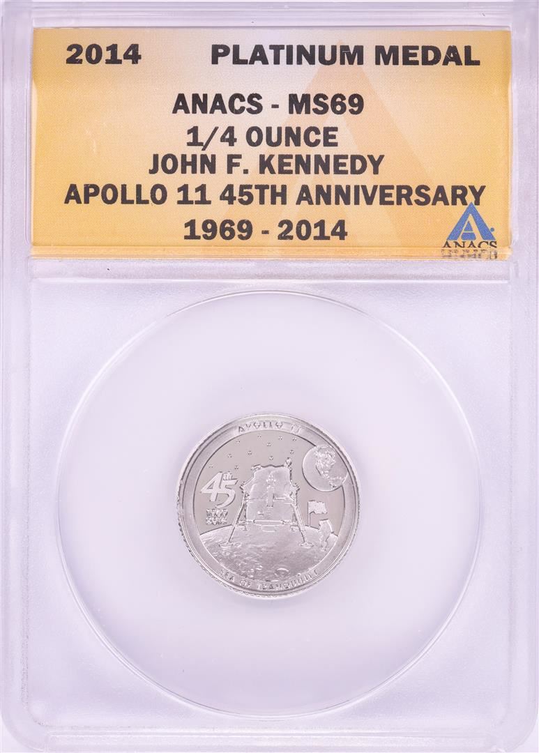 One 2014 Proof 1/4 oz Platinum JFK Apollo 11 Anniversary Medal ANACS MS69. ANACS Certified.