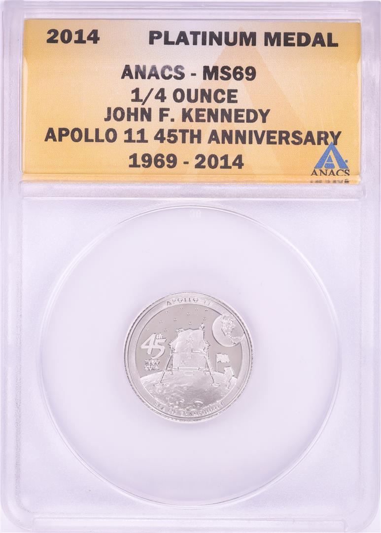 One 2014 Proof 1/4 oz Platinum JFK Apollo 11 Anniversary Medal ANACS MS69. ANACS Certified.