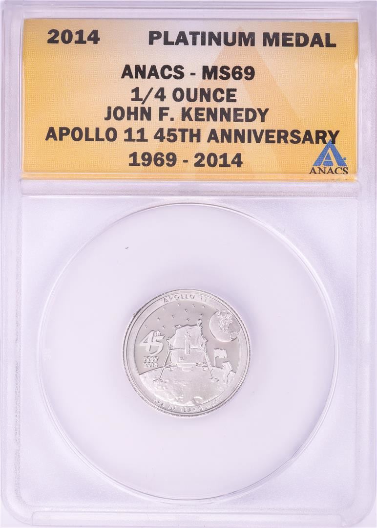 One 2014 Proof 1/4 oz Platinum JFK Apollo 11 Anniversary Medal ANACS MS69. ANACS Certified.