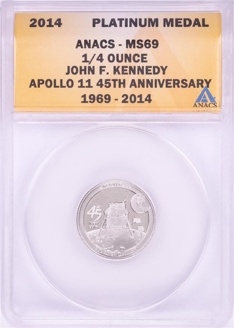 One 2014 Proof 1/4 oz Platinum JFK Apollo 11 Anniversary Medal ANACS MS69. ANACS Certified.