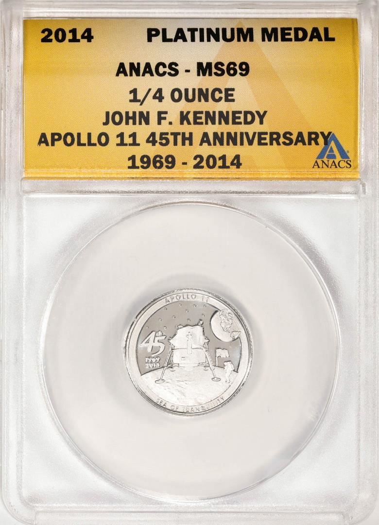 One 2014 Proof 1/4 oz Platinum JFK Apollo 11 Anniversary Medal ANACS MS69. ANACS Certified.