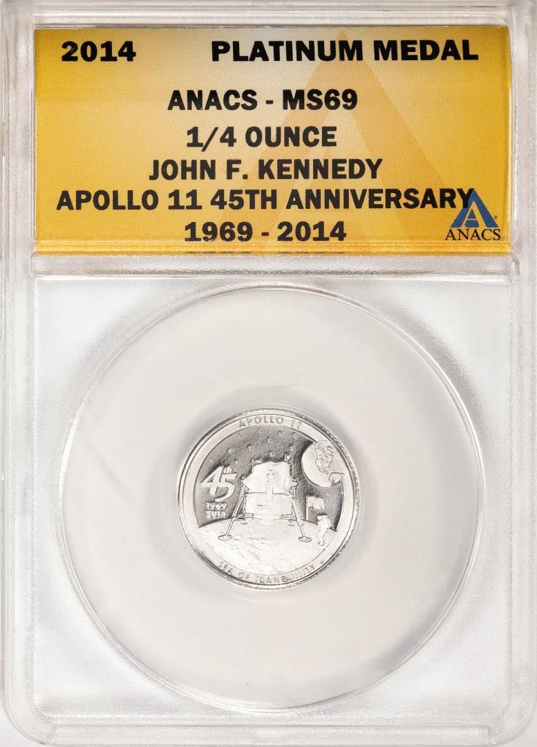 One 2014 Proof 1/4 oz Platinum JFK Apollo 11 Anniversary Medal ANACS MS69. ANACS Certified.
