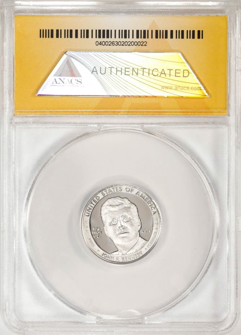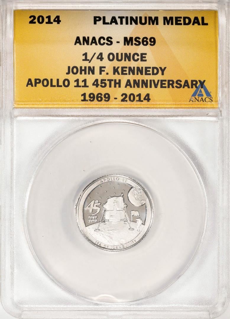 One 2014 Proof 1/4 oz Platinum JFK Apollo 11 Anniversary Medal ANACS MS69. ANACS Certified.