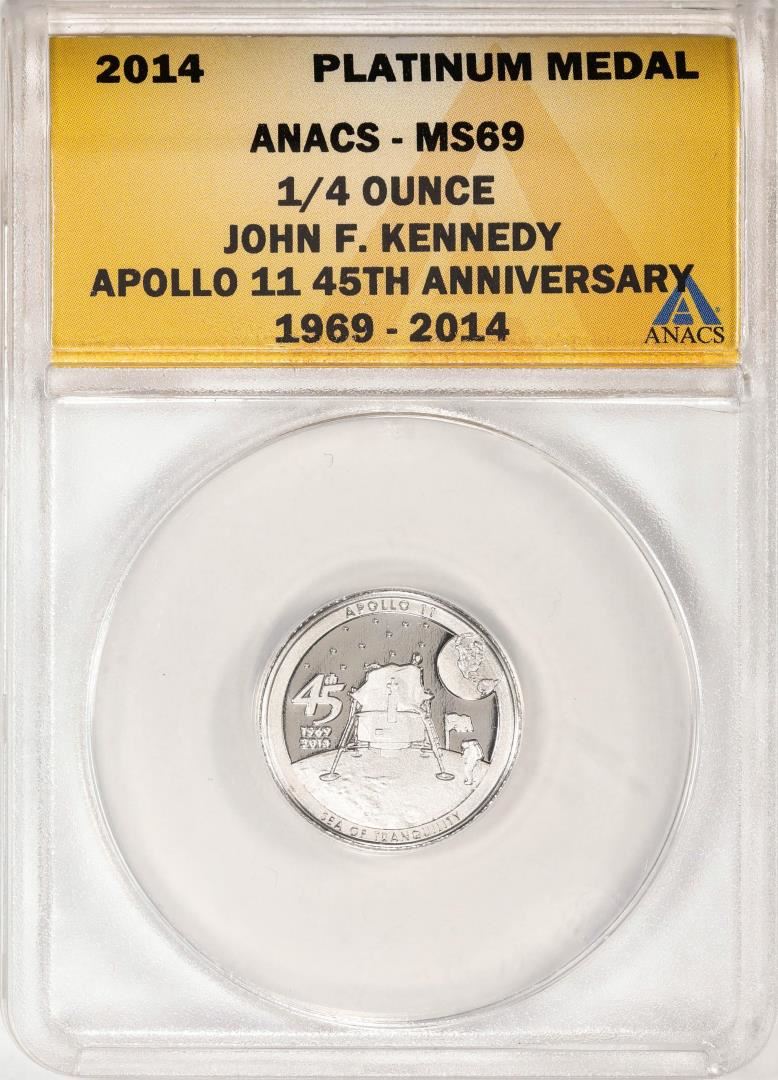 One 2014 Proof 1/4 oz Platinum JFK Apollo 11 Anniversary Medal ANACS MS69. ANACS Certified.