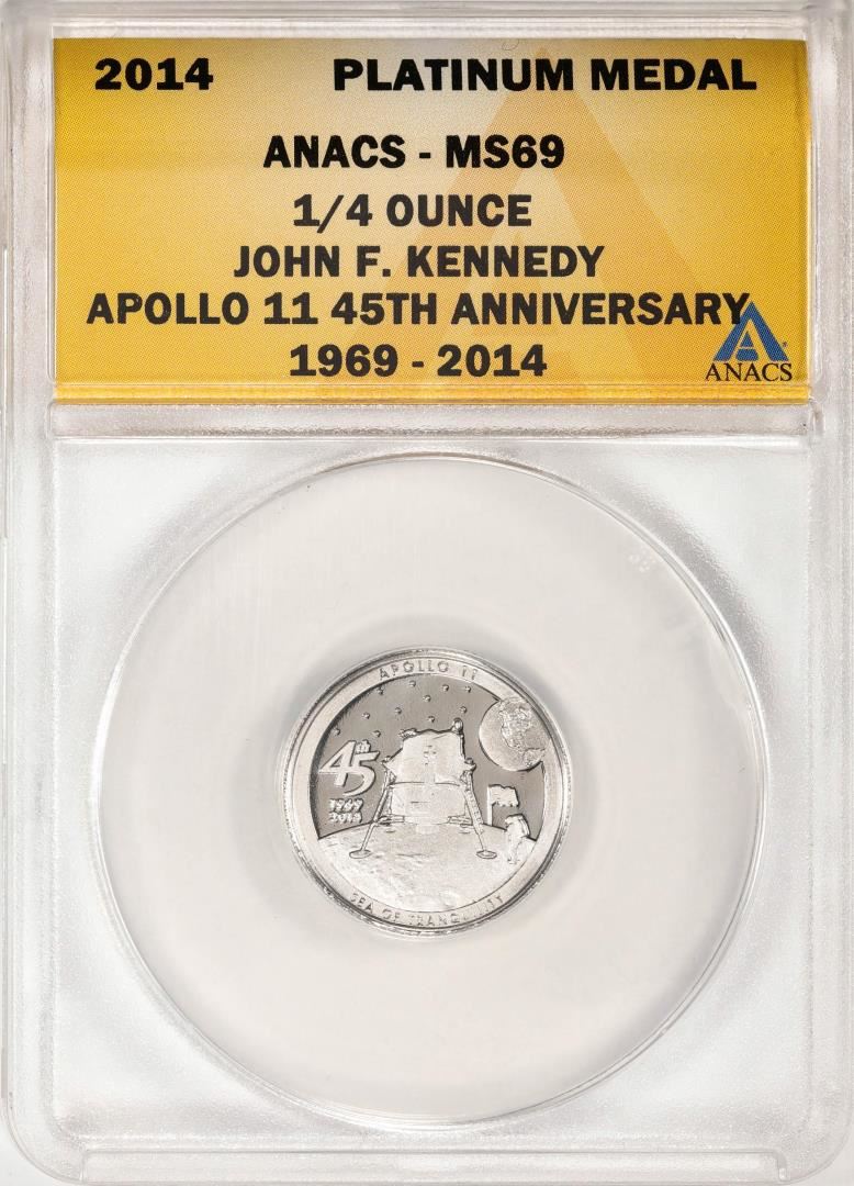 One 2014 Proof 1/4 oz Platinum JFK Apollo 11 Anniversary Medal ANACS MS69. ANACS Certified.