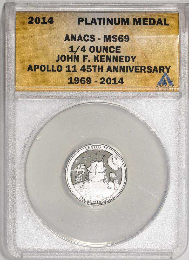 One 2014 Proof 1/4 oz Platinum JFK Apollo 11 Anniversary Medal ANACS MS69. ANACS Certified.