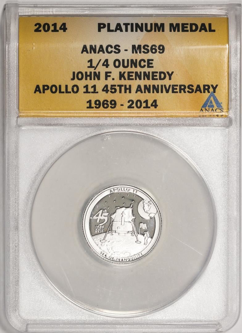 One 2014 Proof 1/4 oz Platinum JFK Apollo 11 Anniversary Medal ANACS MS69. ANACS Certified.