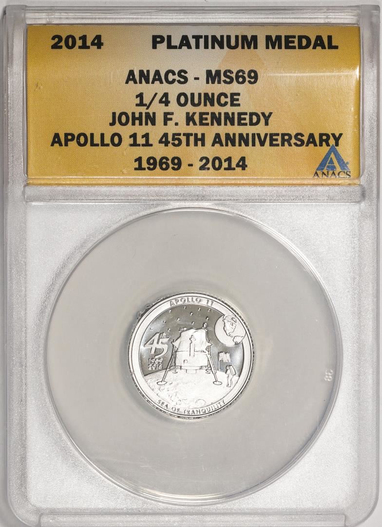 One 2014 Proof 1/4 oz Platinum JFK Apollo 11 Anniversary Medal ANACS MS69. ANACS Certified.