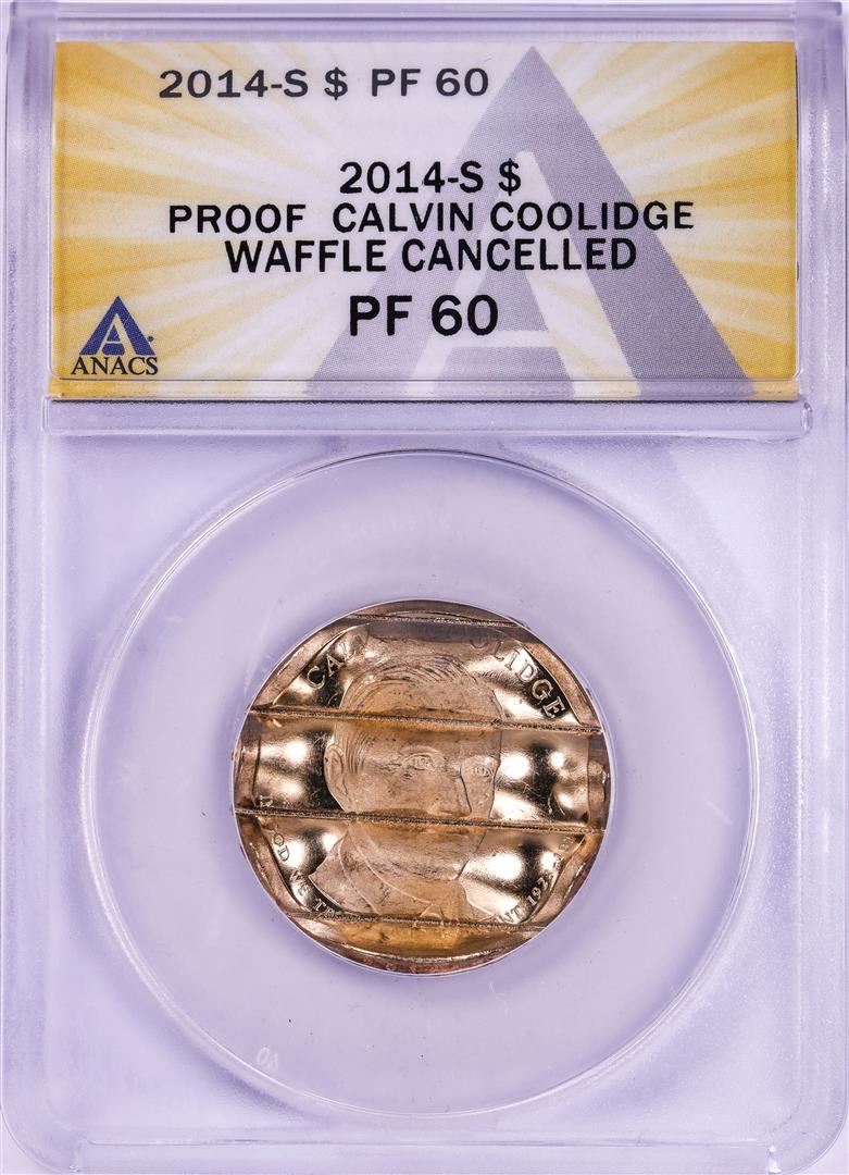 One 2014-S Proof Calvin Coolidge Presidential Dollar Waffle Cancelled Coin ANACS PF60. ANACS Certified.