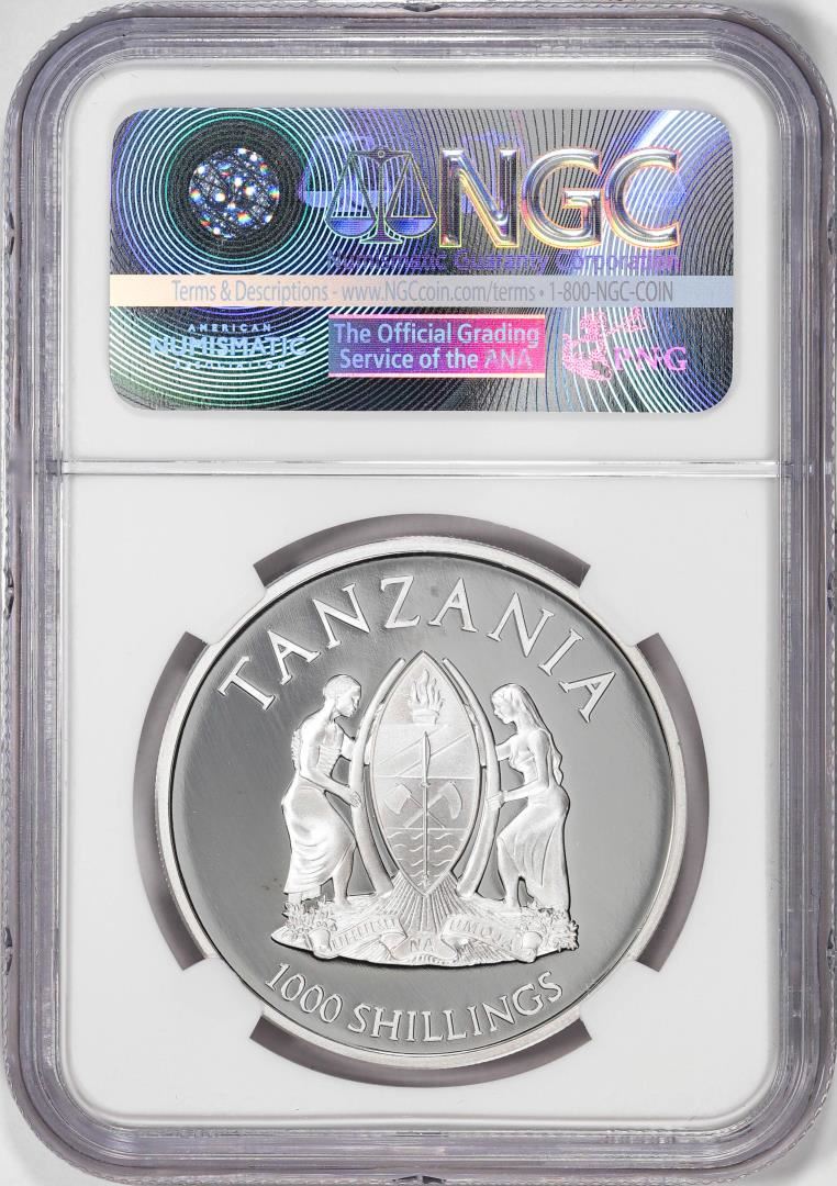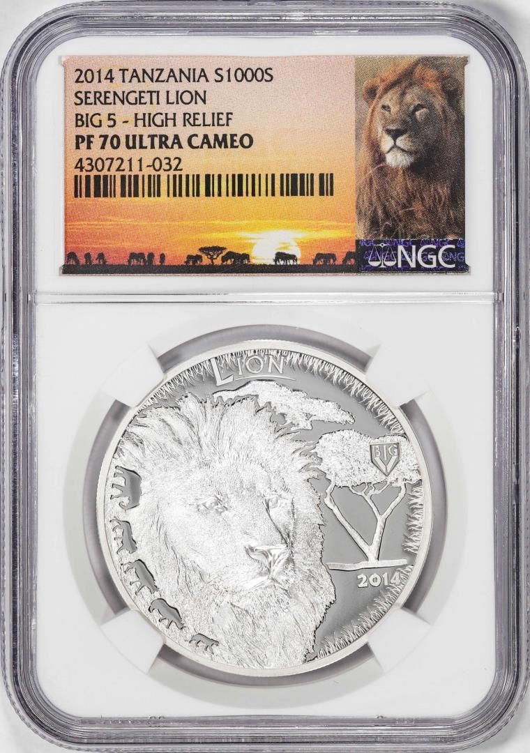 One 2014 Tanzania 1000 Shillings Serengeti Lion Big 5 HR Silver Coin NGC PF70 Ultra Cameo. NGC Certified.