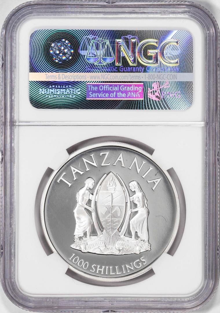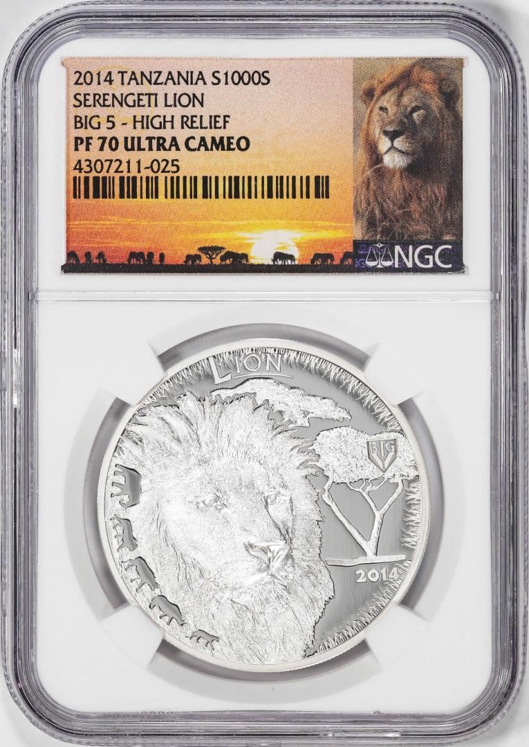 One 2014 Tanzania 1000 Shillings Serengeti Lion Big 5 HR Silver Coin NGC PF70 Ultra Cameo. NGC Certified.