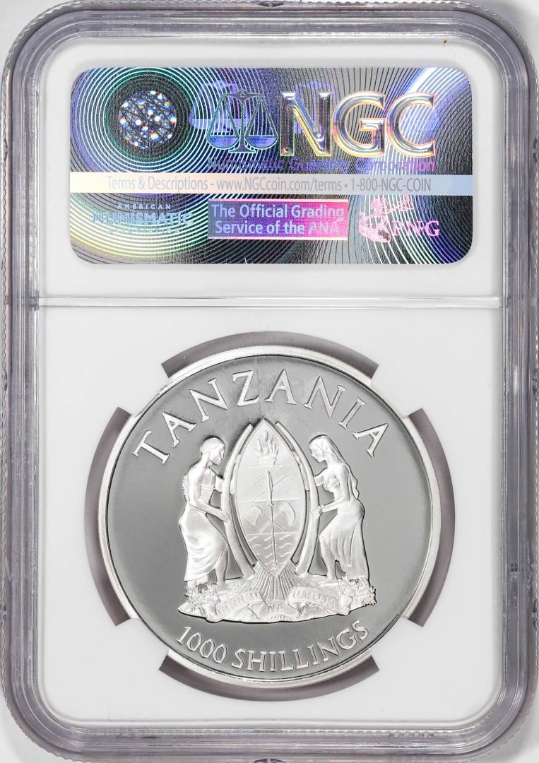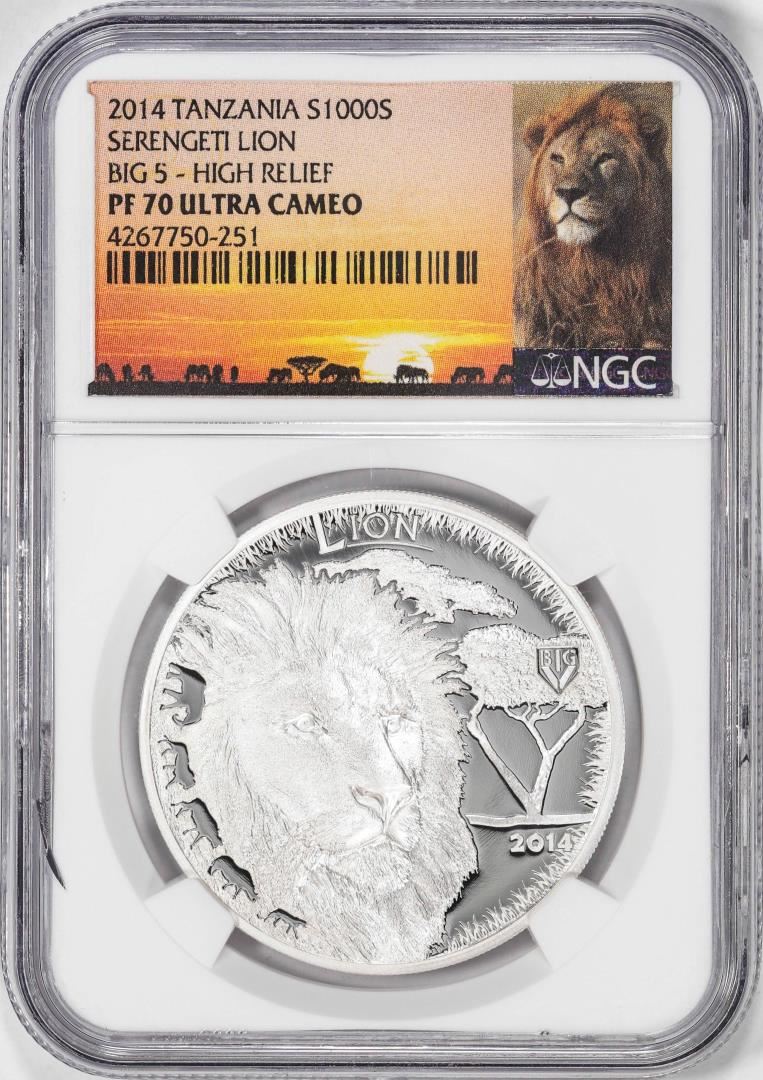 One 2014 Tanzania 1000 Shillings Serengeti Lion Big 5 HR Silver Coin NGC PF70 Ultra Cameo. NGC Certified.