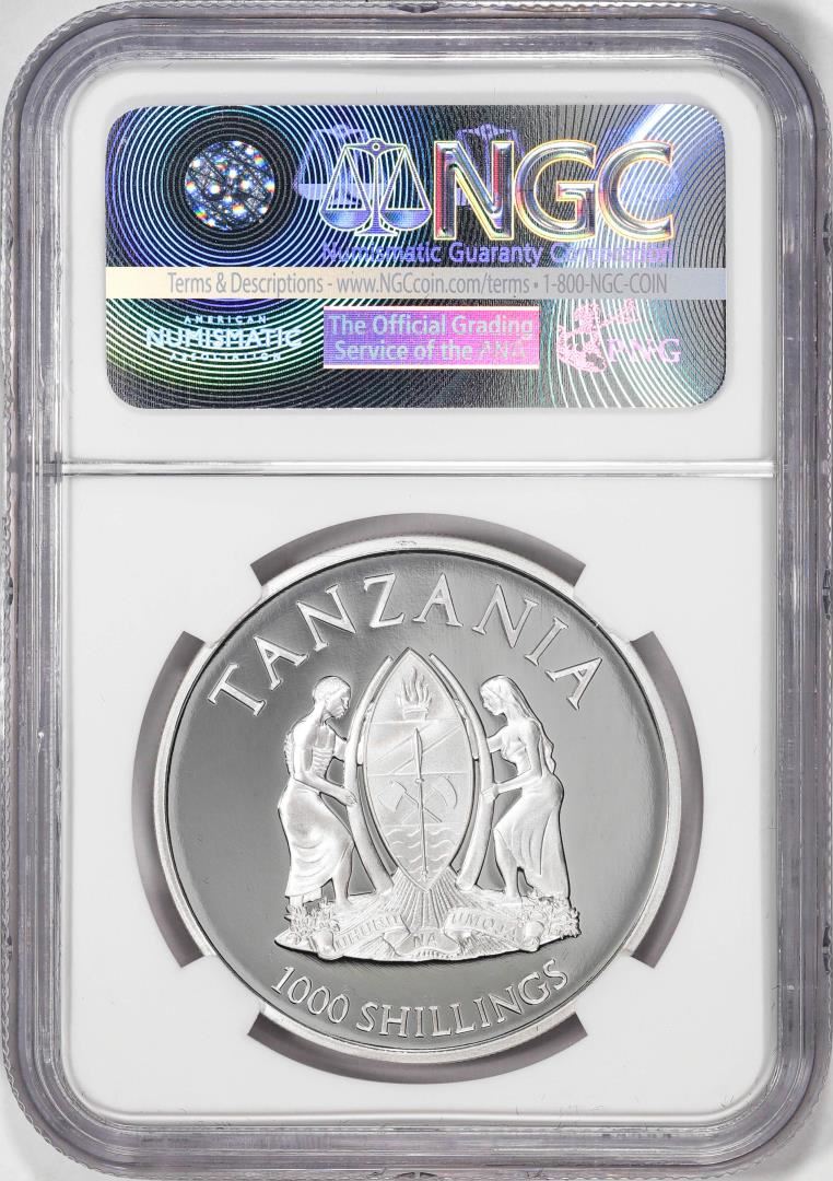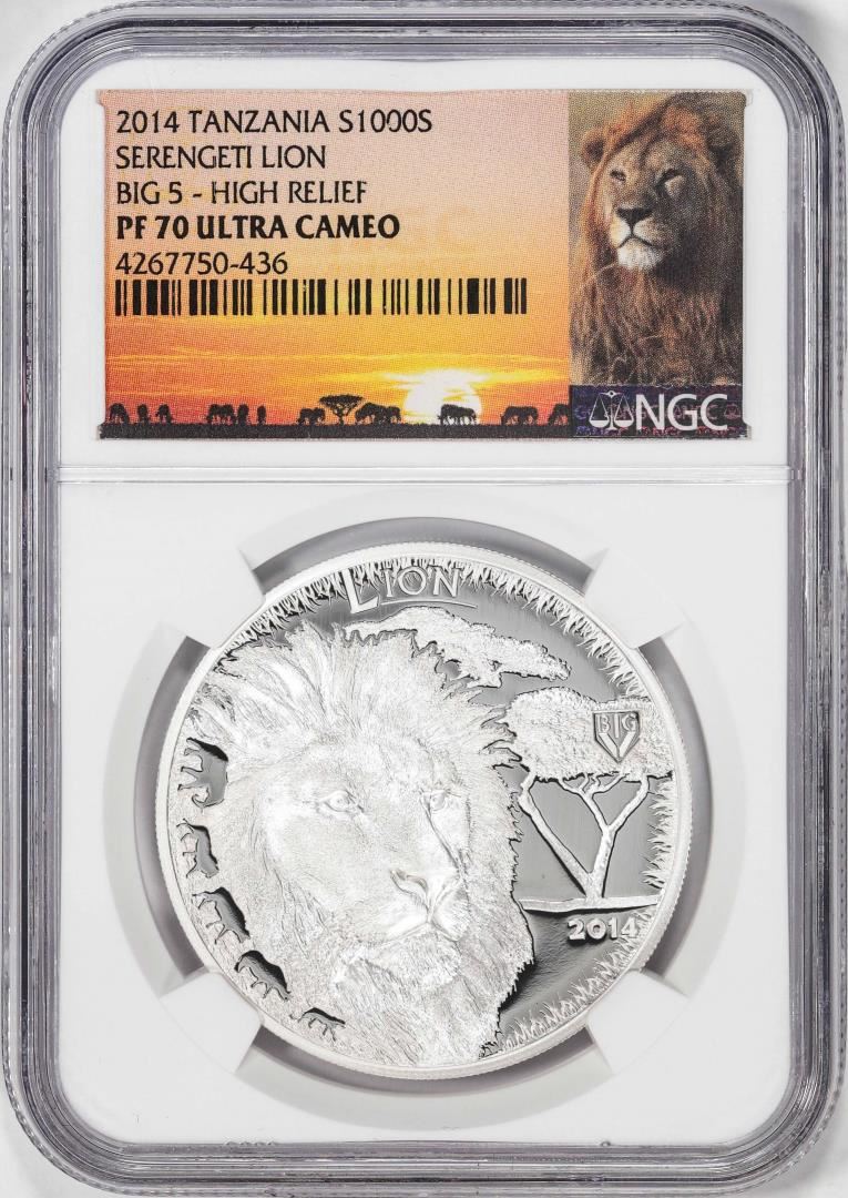 One 2014 Tanzania 1000 Shillings Serengeti Lion Big 5 HR Silver Coin NGC PF70 Ultra Cameo. NGC Certified.