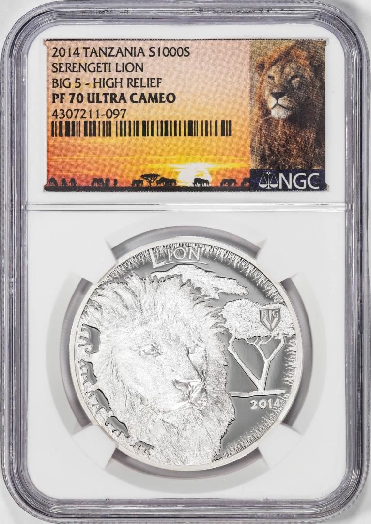 One 2014 Tanzania 1000 Shillings Serengeti Lion Big 5 HR Silver Coin NGC PF70 Ultra Cameo. NGC Certified.