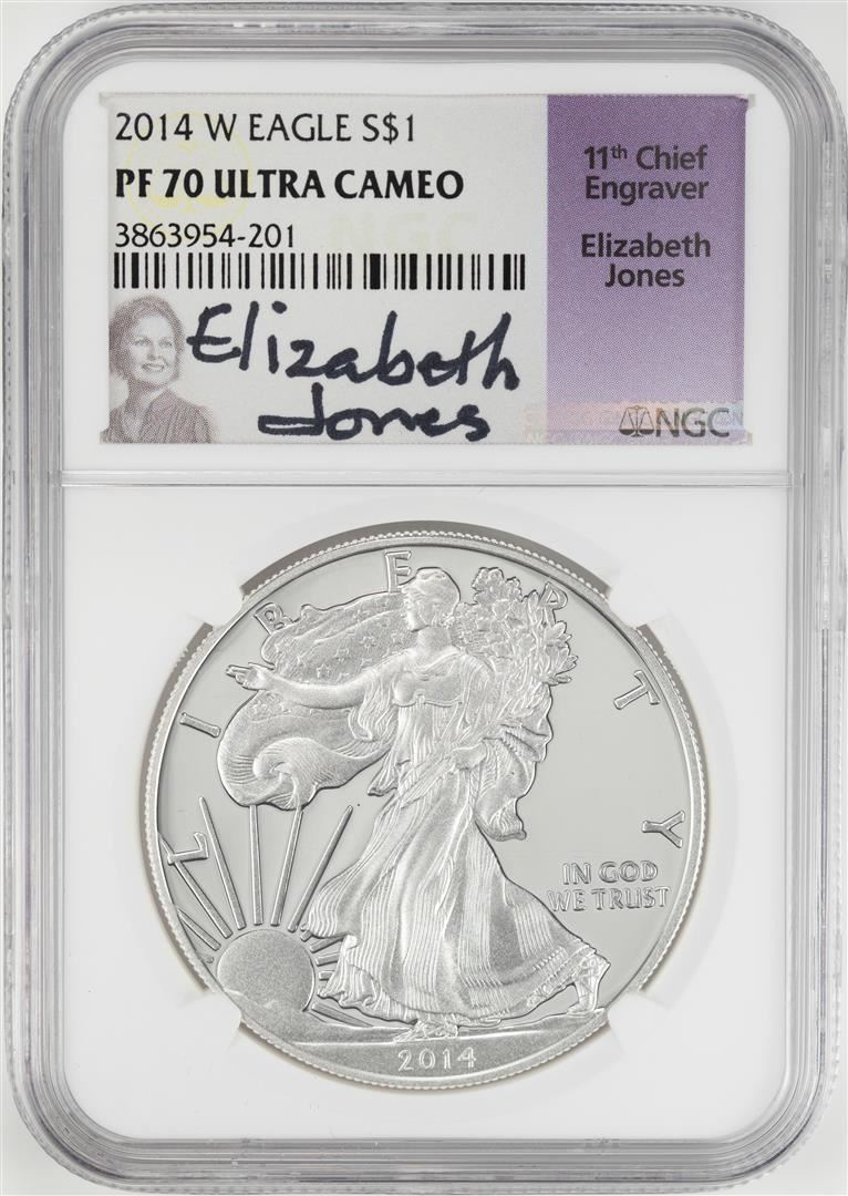 One 2014-W $1 Proof American Silver Eagle Coin NGC PF70 Ultra Cameo Jones Signature. NGC Certified.