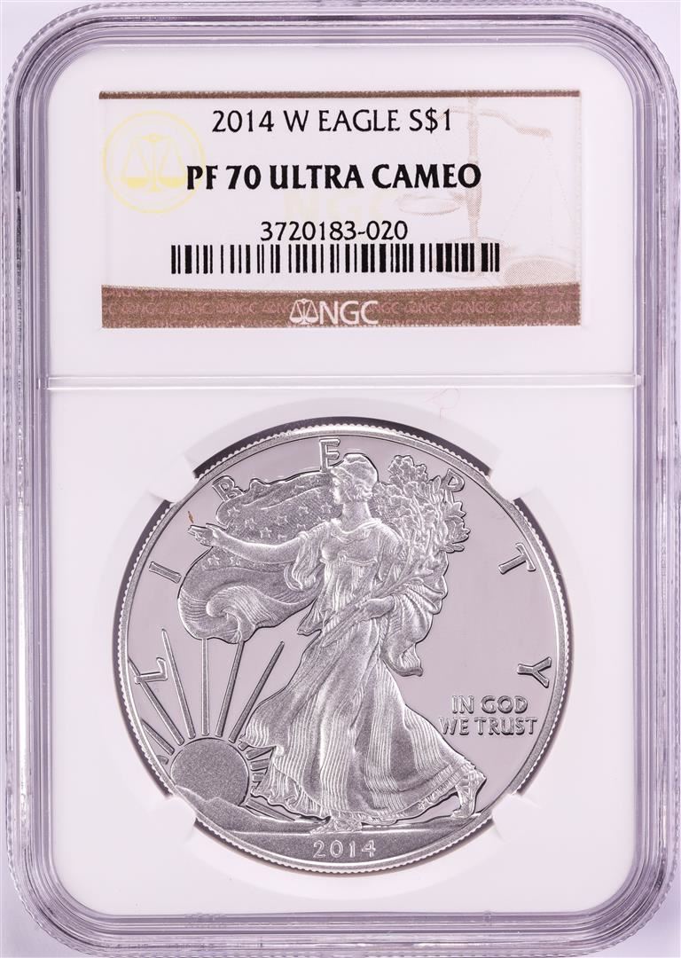 One 2014-W $1 Proof American Silver Eagle Coin NGC PF70 Ultra Cameo. NGC Certified.