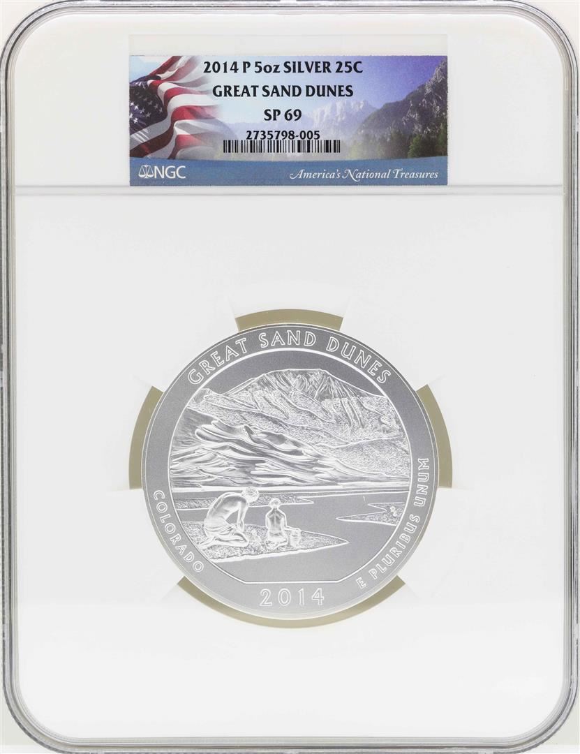 One 2014P 5oz ATB Great Sand Dunes Colorado Silver Coin NGC SP69. NGC Certified.
