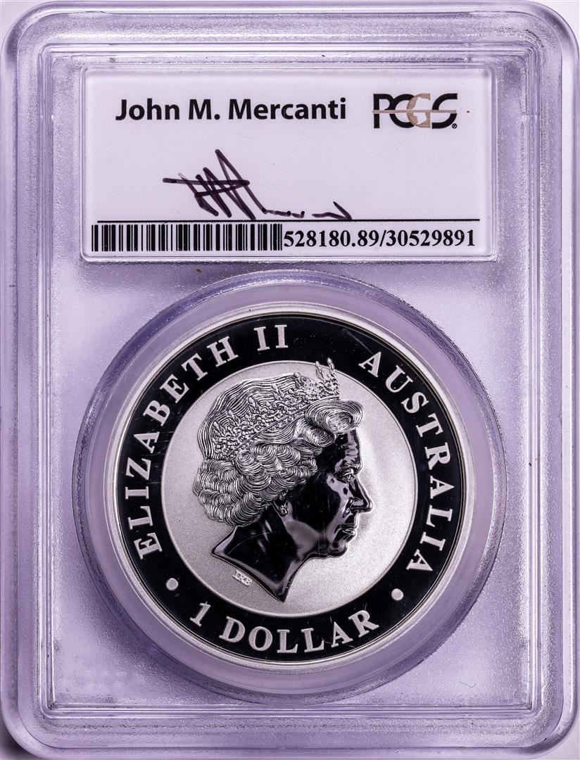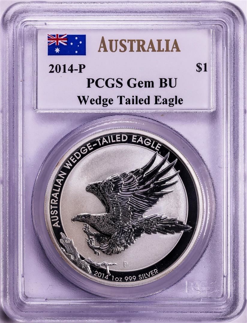 One 2014P Australia $1 Wedge Tailed Eagle Silver Coin PCGS Gem BU Mercanti Signature. PCGS Graded.