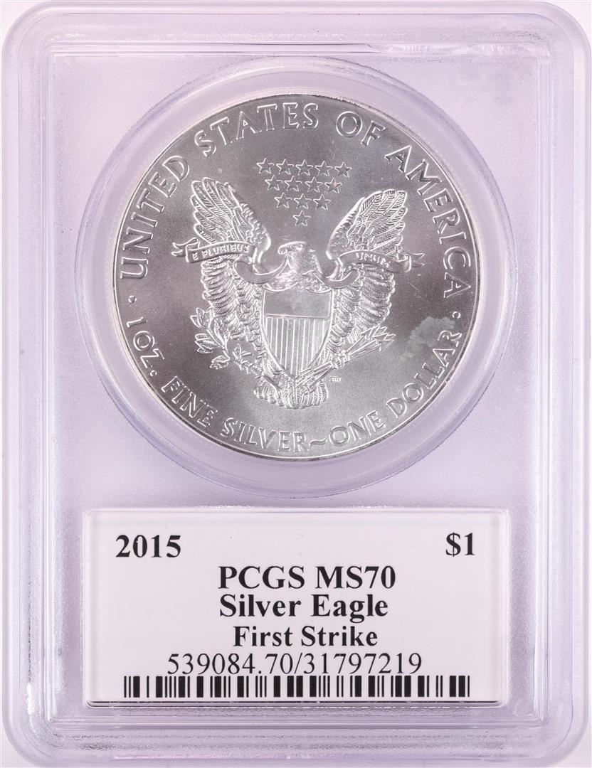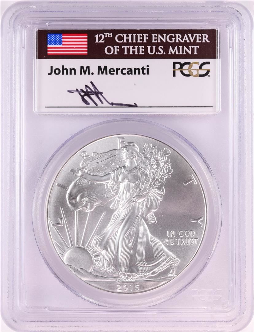 2015 $1 American Silver Eagle Coin PCGS MS70 John Mercanti Signature First Strike