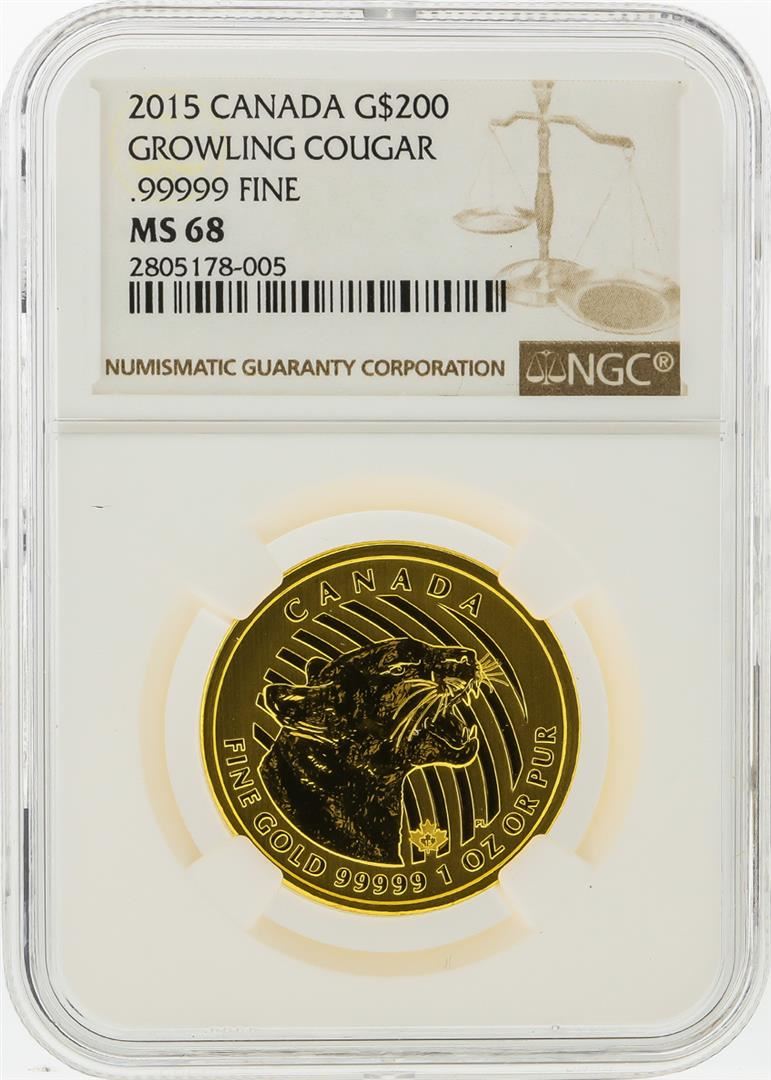One 2015 $200 Canada Growling Cougar Gold Coin NGC MS68. NGC Certified.