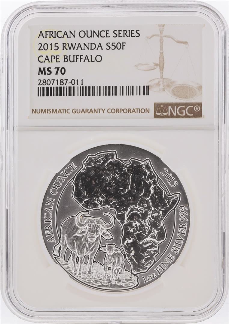 One 2015 50 Francs Cape Buffalo Silver Coin NGC Graded MS70. NGC Certified.
