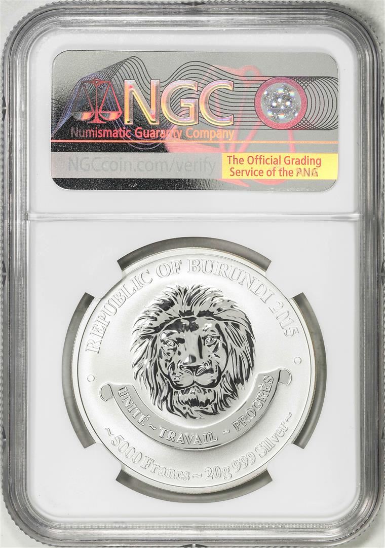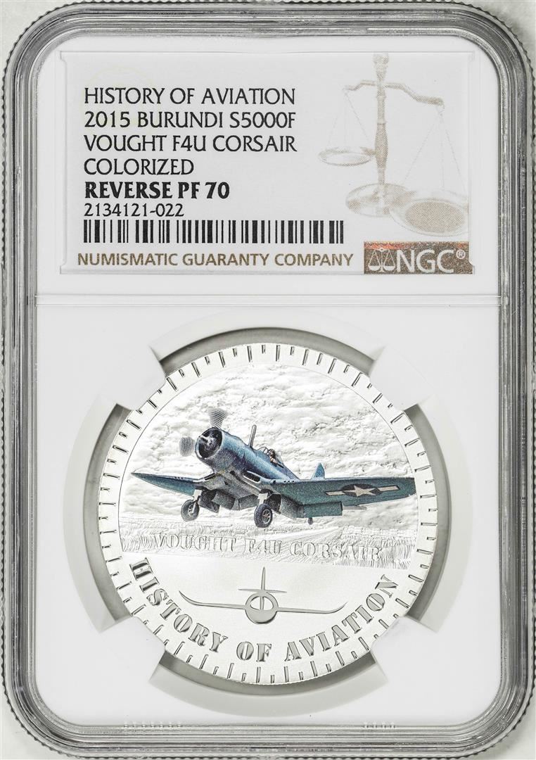 One 2015 Burundi 5000 Francs Aviation History Vought F4U Corsair Silver Coin NGC Rev PF70. NGC Certified.
