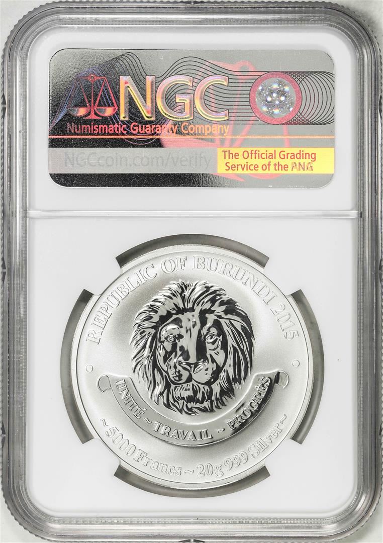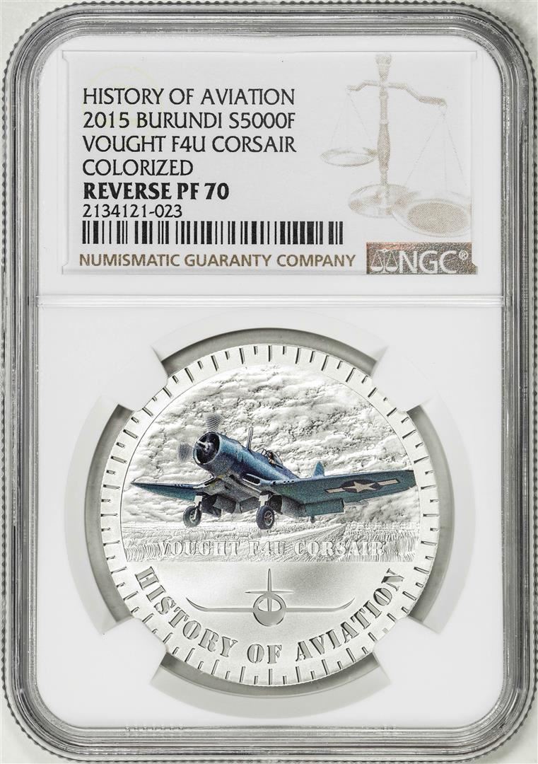 One 2015 Burundi 5000 Francs Aviation History Vought F4U Corsair Silver Coin NGC Rev PF70. NGC Certified.