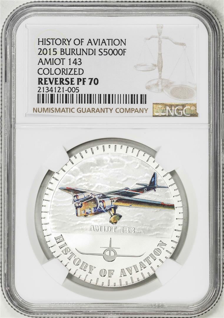 One 2015 Burundi 5000 Francs History of Aviation Amiot 143 Silver Coin NGC Reverse PF70. NGC Certified.