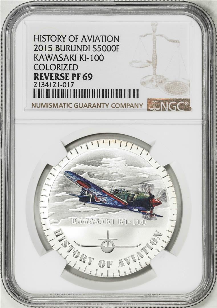 One 2015 Burundi 5000 Francs History of Aviation Kawasaki KI-100 Silver Coin NGC Rev PF69. NGC Certified.