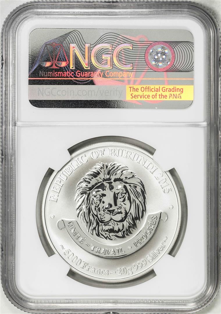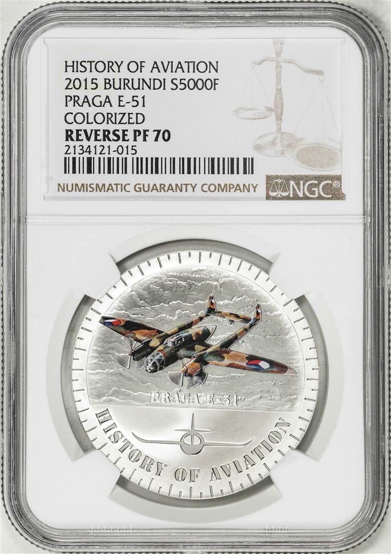 One 2015 Burundi 5000 Francs History of Aviation Praga E-51 Silver Coin NGC Reverse PF70. NGC Certified.