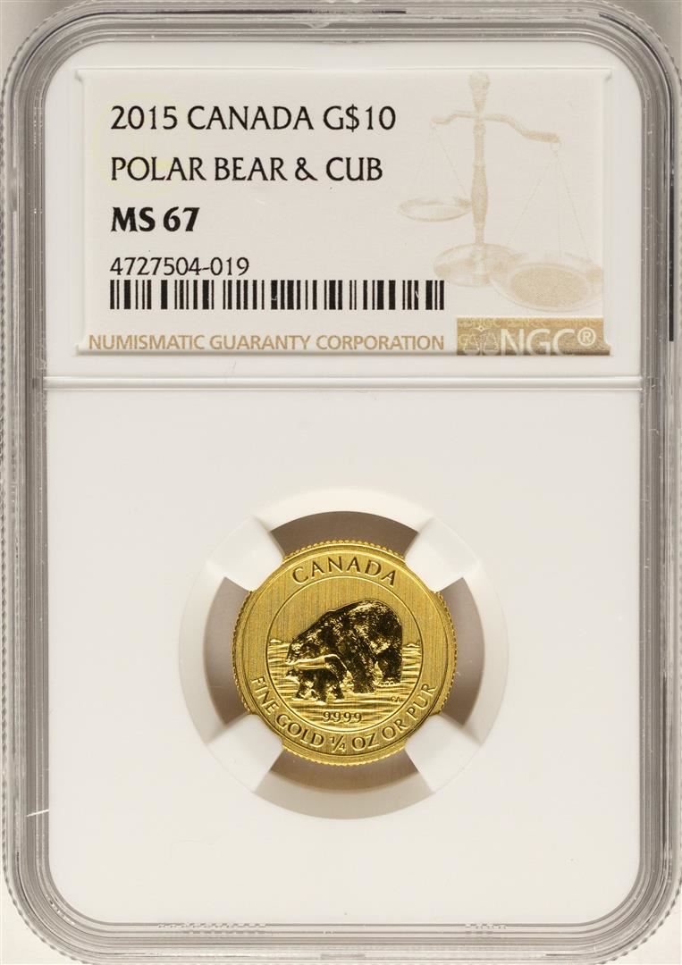 One 2015 Canada $10 Polar Bear Gold Coin NGC MS67. NGC Certified.