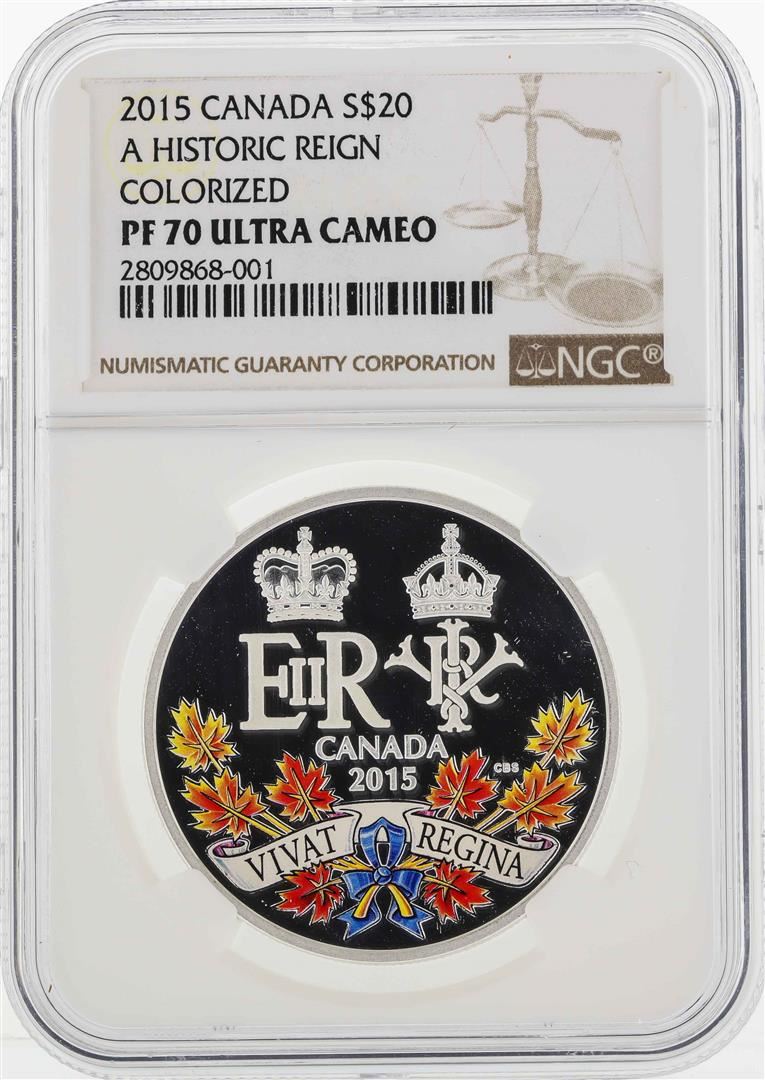 One 2015 Canada $20 Historic Reign Colorized Silver Coin NGC PF70 Ultra Cameo. NGC Certified.
