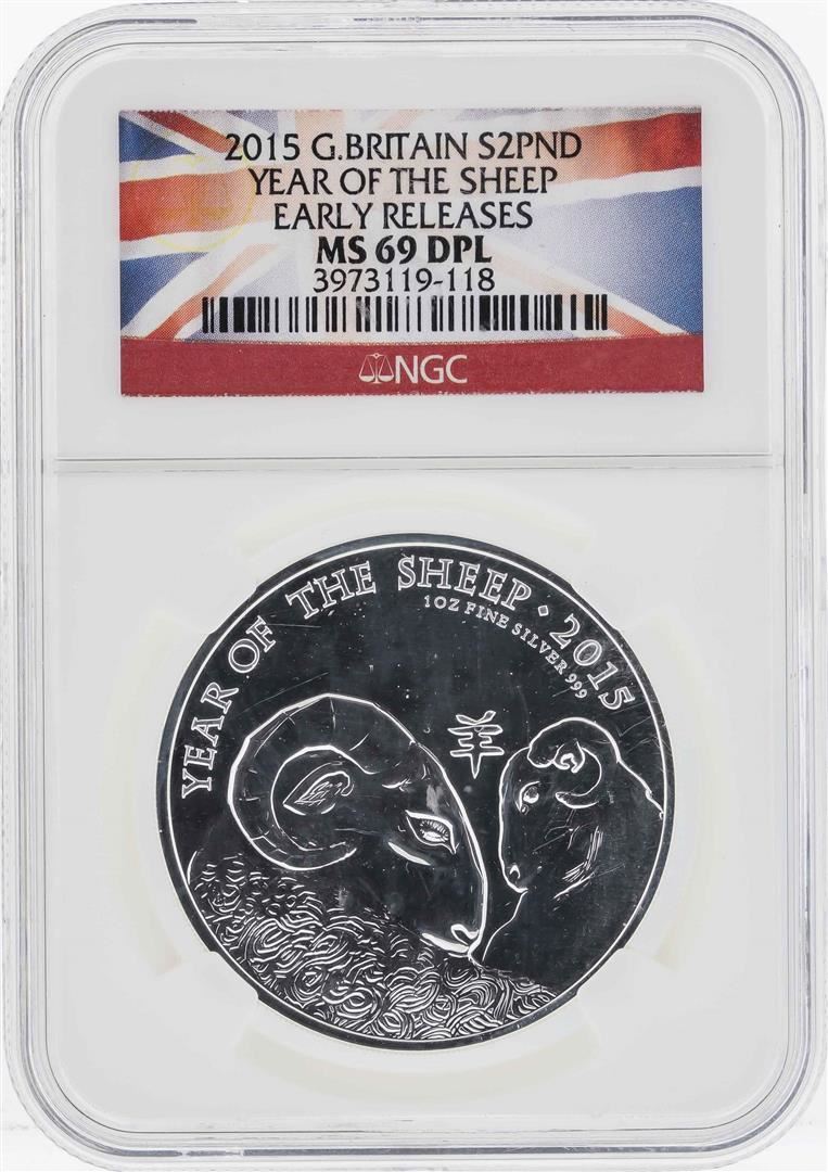 One 2015 Great Britain 2 Pounds Year of the Sheep Silver Coin NGC MS69DPL. NGC Certified.
