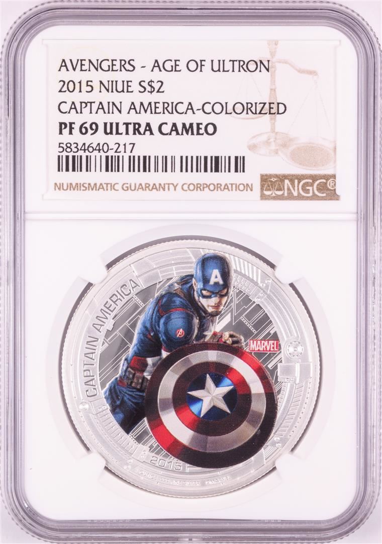 One 2015 Niue $2 Proof Avengers Age of Ultron Captain America Silver Coin NGC PF69 Ultra Cameo. NGC Certified.