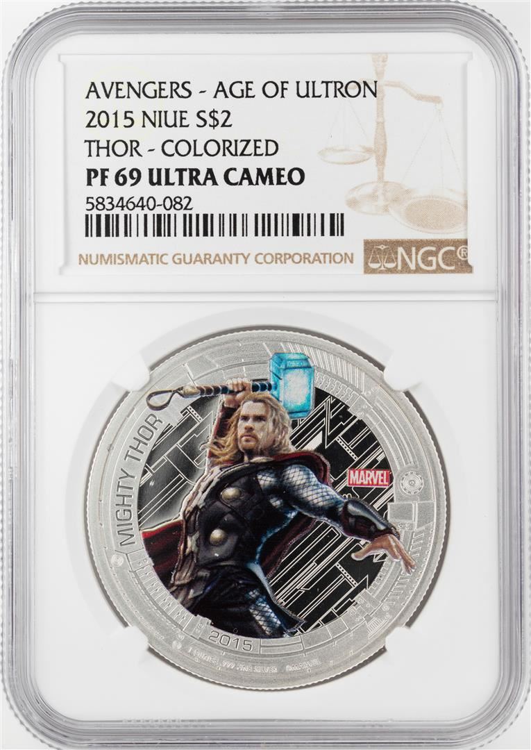 One 2015 Niue $2 Proof Avengers Age of Ultron Thor Silver Coin NGC PF69 Ultra Cameo. NGC Certified.