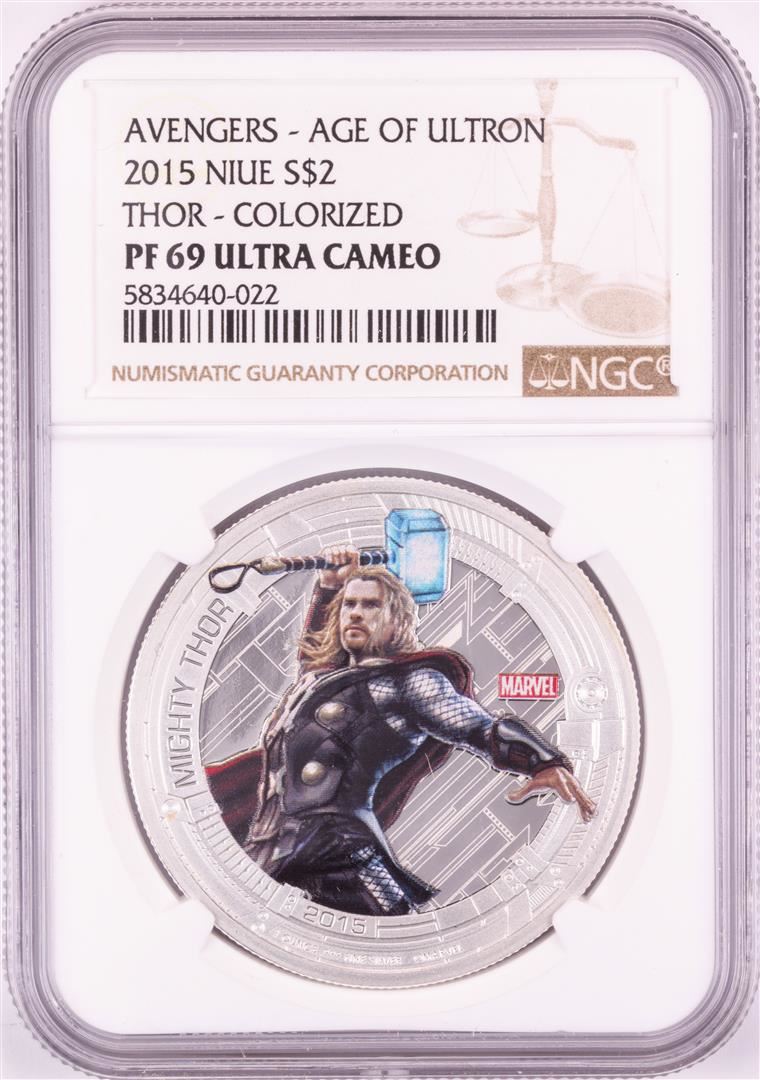 One 2015 Niue $2 Proof Avengers Age of Ultron Thor Silver Coin NGC PF69 Ultra Cameo. NGC Certified.