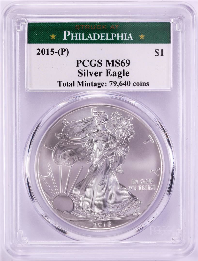 One 2015-(P) $1 American Silver Eagle Coin PCGS MS69 Struck at Philadelphia.