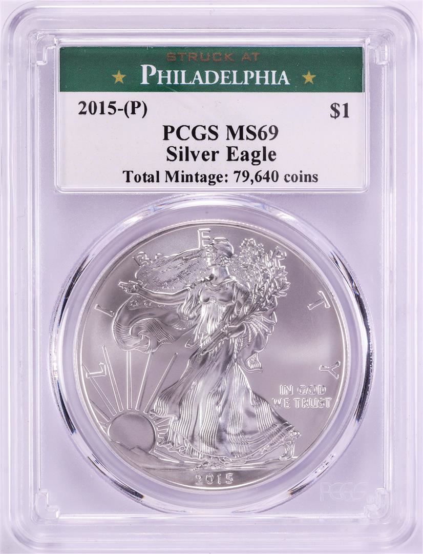 One 2015-(P) $1 American Silver Eagle Coin PCGS MS69 Struck at Philadelphia.