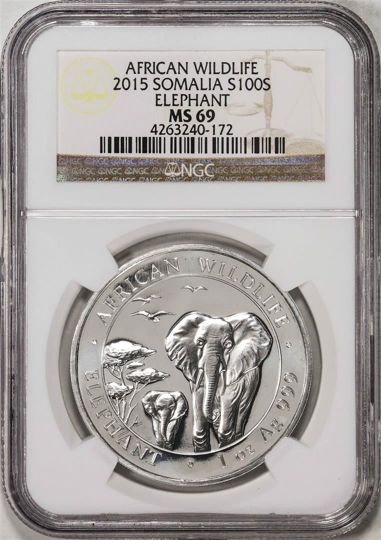 One 2015 Somalia 100 Shillings African Wildlife Elephant Silver Coin NGC MS69. NGC Certified.