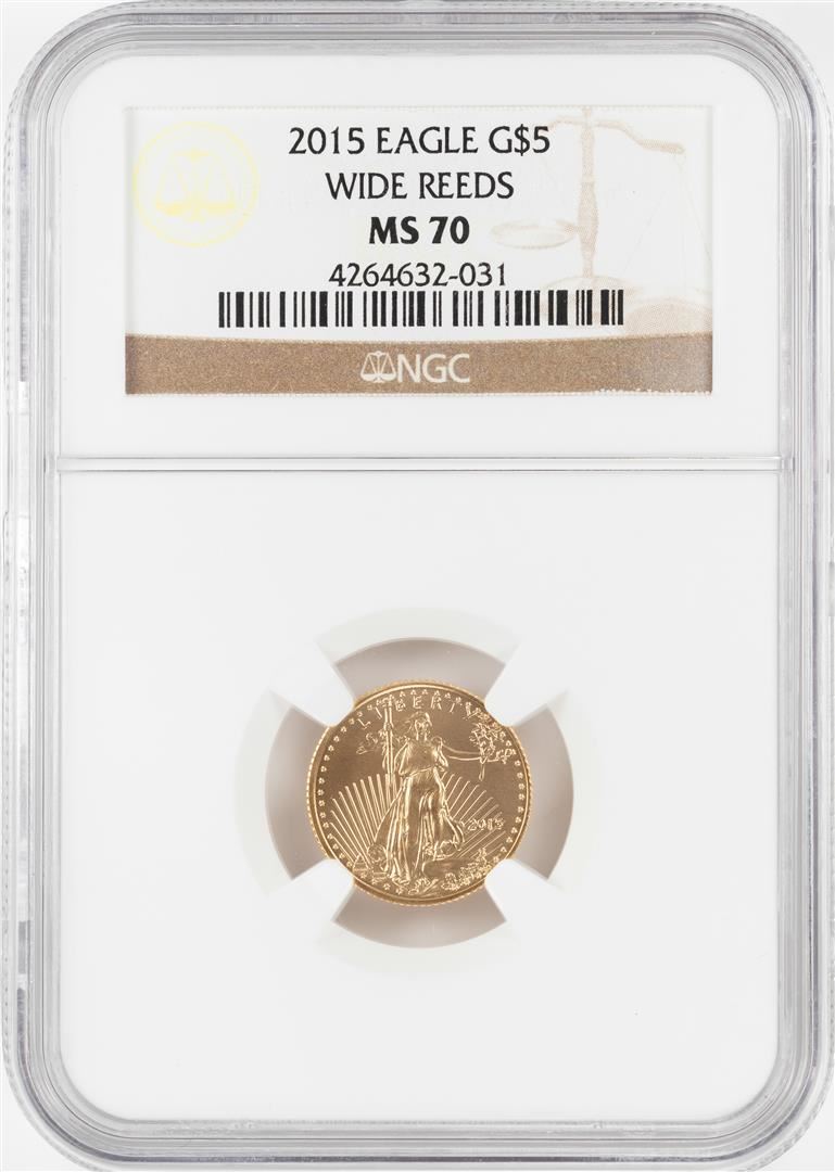 One 2015 Wide Reeds $5 American Gold Eagle Coin NGC MS70. NGC Certified.